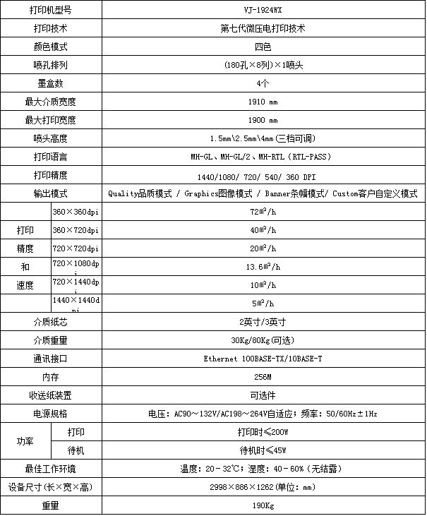 ? 一組第七代打印頭,四色(CMYK)打印機;? 最大打印幅寬1,900mm,最高打印速度72平米/小時;? 七級墨滴可控技術,I2智能交織打印技術;? 支持介質自動裁切,打印頭高度三檔可調;? 獨創二級墨袋技術,左右兩側維護倉設計。
